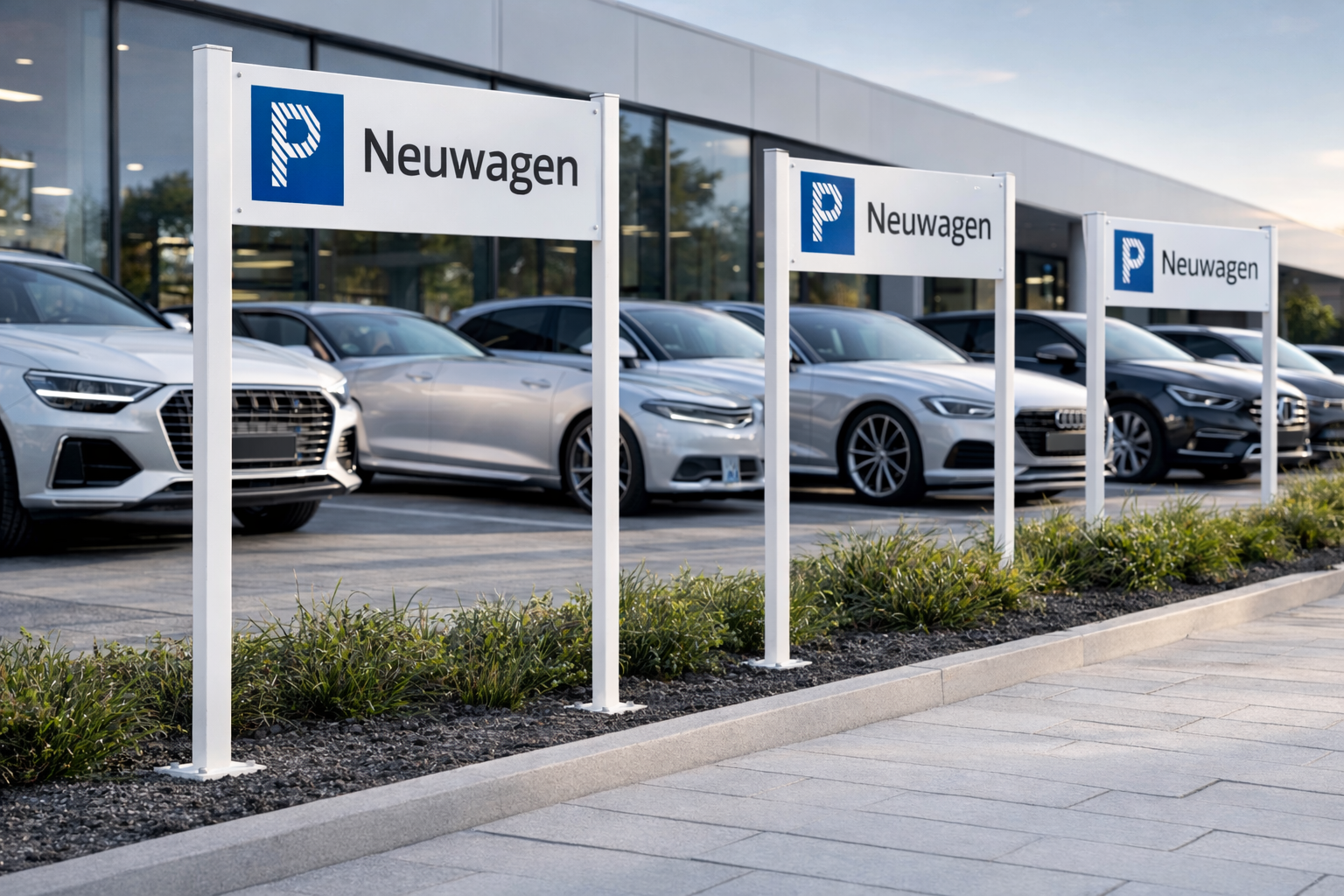 Robustes, wetterfestes Schild für private oder gewerbliche Stellplätze. Rahmen aus pulverbeschichtetem Aluminium, wahlweise mit Flanschplatte oder Erdpin.